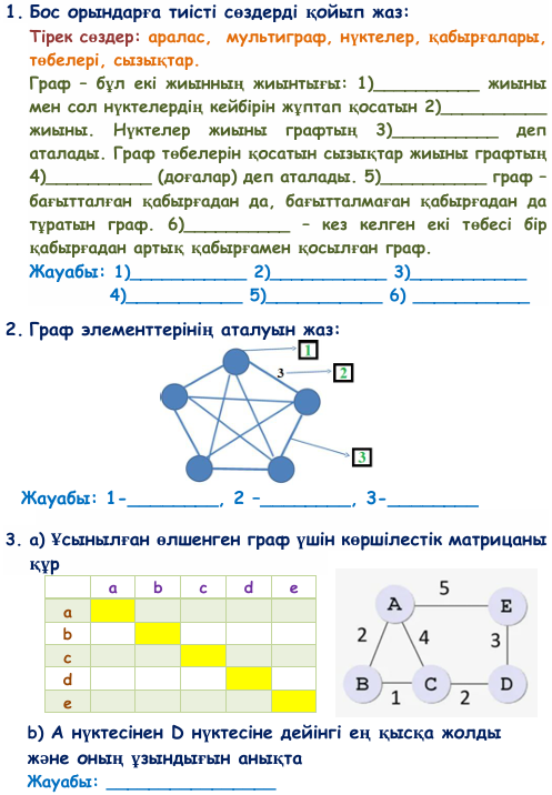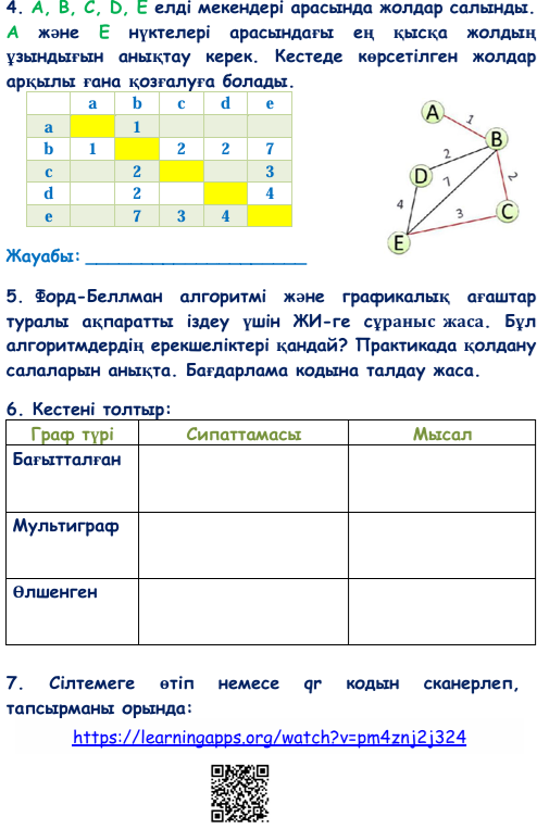 Бағалау критерийі: іргелес матрица бойынша граф сызбасын салады. Дескриптор: * граф түсінігін береді, не үшін қолданылатынын сипаттайды ФБ Бағалау критерийі: графиктердің негізгі қасиеттерін және олармен жұмыс істеу алгоритмдерін қолданады Дескриптор: -тиісті сөздерді енгізеді (3 ұпай) - граф элементтерінің аталуын жазады (1 ұпай) Көршілес матрицаны салады Ең қысқа жол мен ұзындықты анықтайды (2 ұпай) Ең қысқа жолдың ұзындығын анықтайды (1 ұпай) Бағдарлама кодын талдайды (1 ұпай) Кестені толтырады (1 ұпай) жиектер тізімін және іргелес матрицаны есептеп, нәтижесін жазады (1 ұпай) |