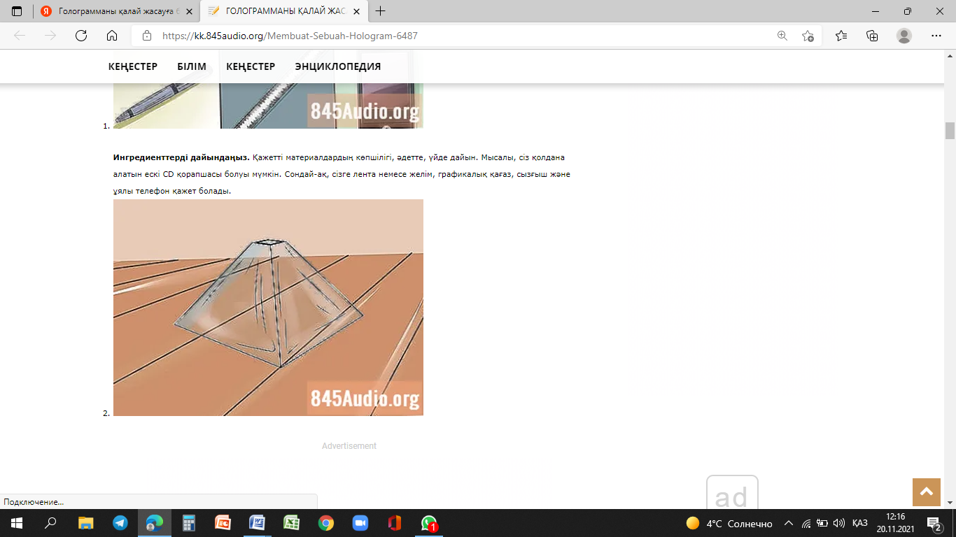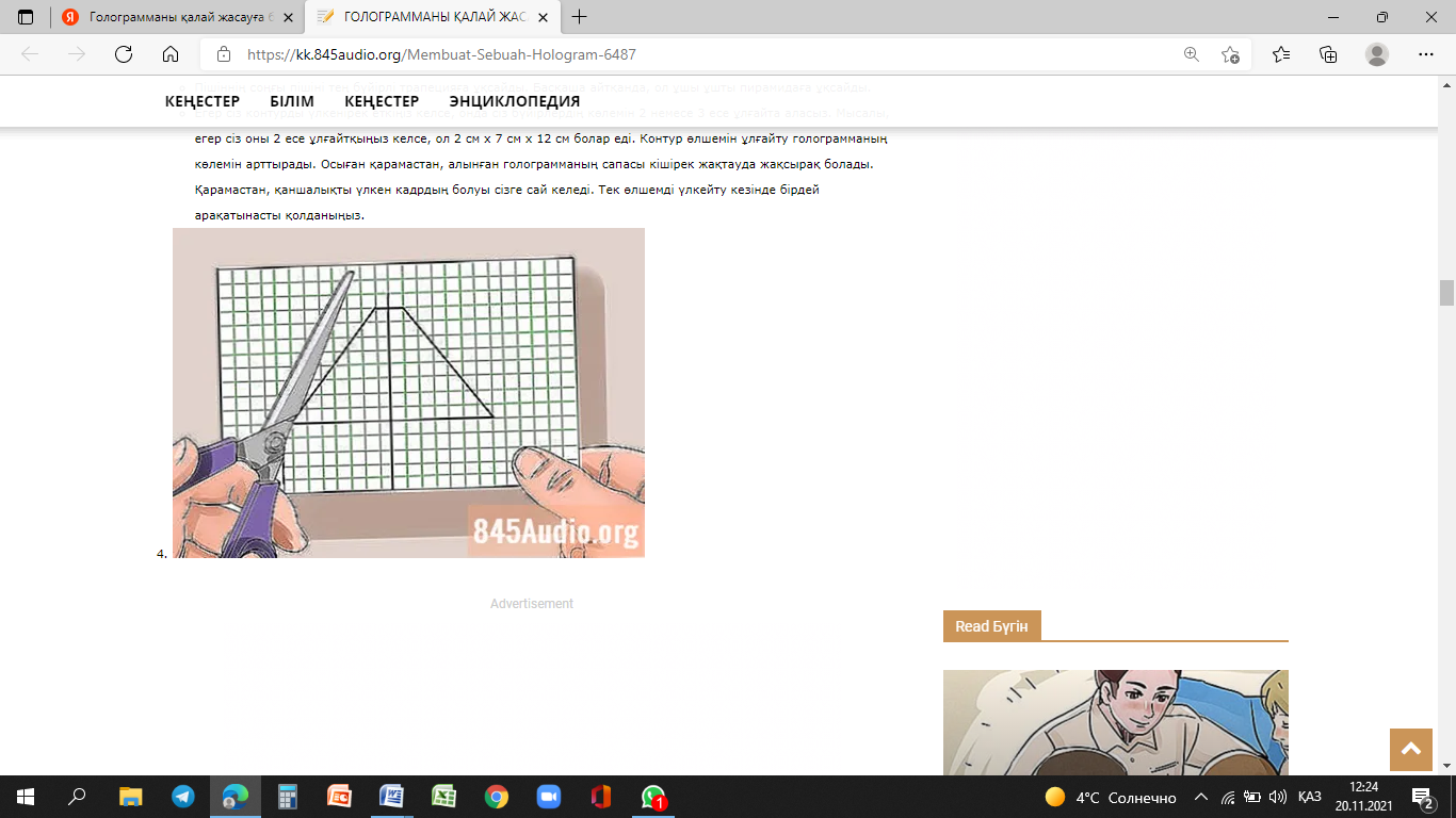 3D голограммаларын жасау іс жүзінде сіздер ойлағаннан да оңайырақ. Тек ұялы телефонмен және бірнеше парақ пластмассамен сіз қарапайым 2D кескіндерді үйіңізде 3D-ге айналдырасыз, дәлірек айтсам, алақанда. Сізге тек үйде дайын болатын бірнеше заттар қажет, және тек 30 минут! [3]
