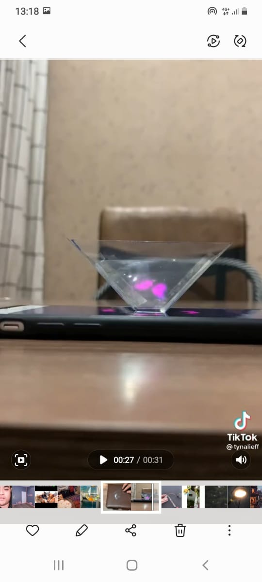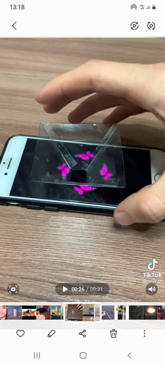 Телефонда қарапайым бейнені немесе қозғалмалы суретті қосыңыз (ютуб каналы) . Жүзіп жүрген балықтың, айнала қозғалатын гүлдің бейнесі сәйкес келеді. Телефон экранында суреттерді немесе бейнелерді қолданыңыз. Қандай нәрсені таңдасаңыз да, сурет голограмма түрінде көрініс табады.