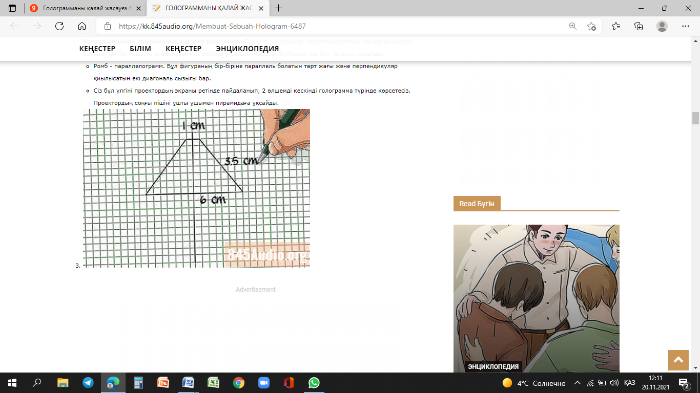 Контур өлшемін графикалық қағазға белгілеу. Бұл үлгі голограмма проекторы ретінде пайдаланылатын боламын. Ол бір уақытта құрастырылған ромбқа ұқсайды, мысалы, бүйірлері көлбеу текшеге ұқсайды.