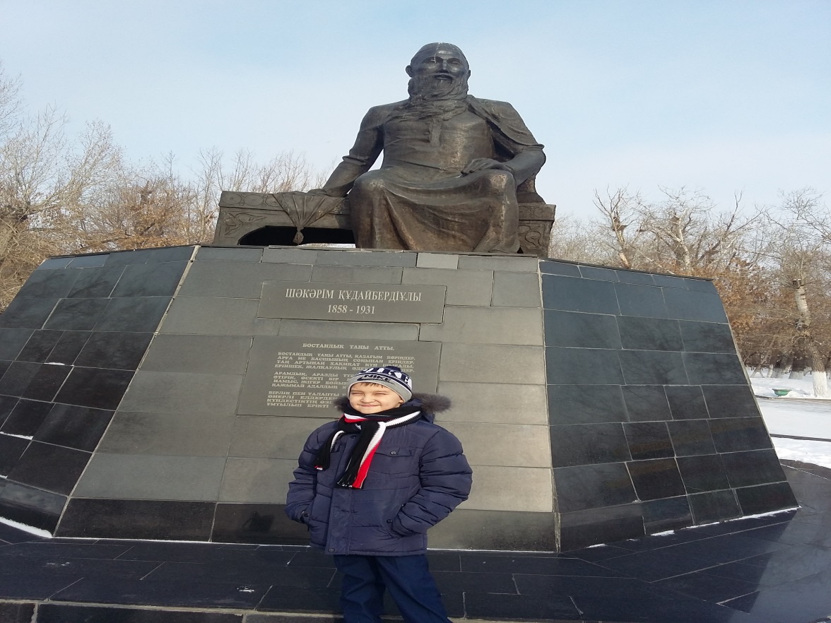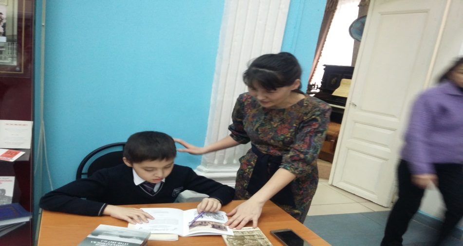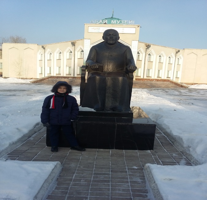 Суретте көрсетілген мұражай ғылыми қызметкері Біржан Ахмерұлымен мұражай бөлмелелерін аралап, Абайдың өмірі, қызметі және шығармашылығы жайында көптеген деректермен танысып, мағлұматтар жинауыма мүмкіндік алдым.