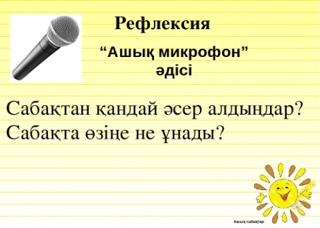 Оқушылар өз ойларын ауызша жеткізеді. Оқушылар бейнематериалды көрген соң пікірталасқа арналған сұрақтарға жауап береді Оқулықта көрсетілген «Беу айдай »әнін біргелікте орындайды. Оқушылар сабақтан алған әсерлерін «Ашық микрафон» әдісі арқылы жеткізеді |