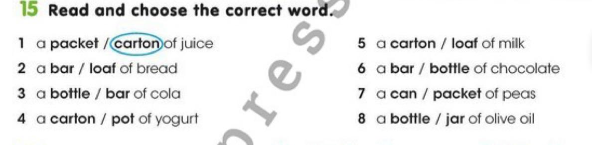 Lead-In Vocabulary. - Introduce foodmeasure words using pictures. Teacher presents new words with pictures: a packet of peas, a pot of yogurt,a jar of honey, a bottle of bread,a loaf of bread, a carton of juice, a bar of chocolate, watermelon,walnut,cracker,peanut,crisps. Task 1.Individual task. Read and choose the correct word. Smiles pupil’s book Ex:15 p:88