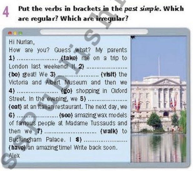I.Pre-writing task Teacher asks students about of Past Simple and types of verbs. All students tell about types of verbs. Time warm up Writing. Ex 2. Put the verbs in brackets in the past simple. Which are regular? Which are irregular?