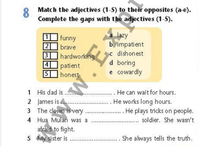 Ex 1. Match the adjectives (1-5) to their oppisities (a-e). Complete the gaps with the adjectives