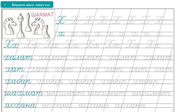 Хх дыбысымен таныстыру және Хх әрпінің жазылу Муғалімнің көмегімен сөз,сөйлем,мәтінді тексеру Жазу жолын жоларалықты,жолдың жоғарғы және төменгі сызықтарын сақтап жазу |