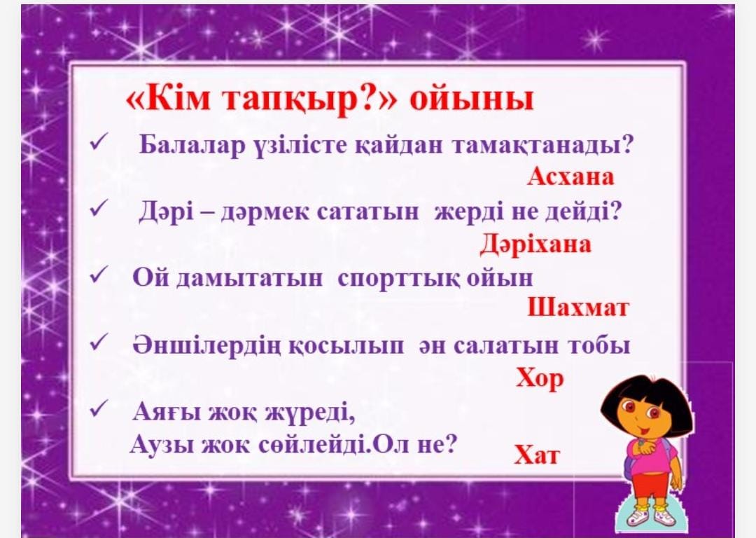 Дескриптор: Жұмбақтың шешімін табады-1б Сұрақтарға жауап береді-1б