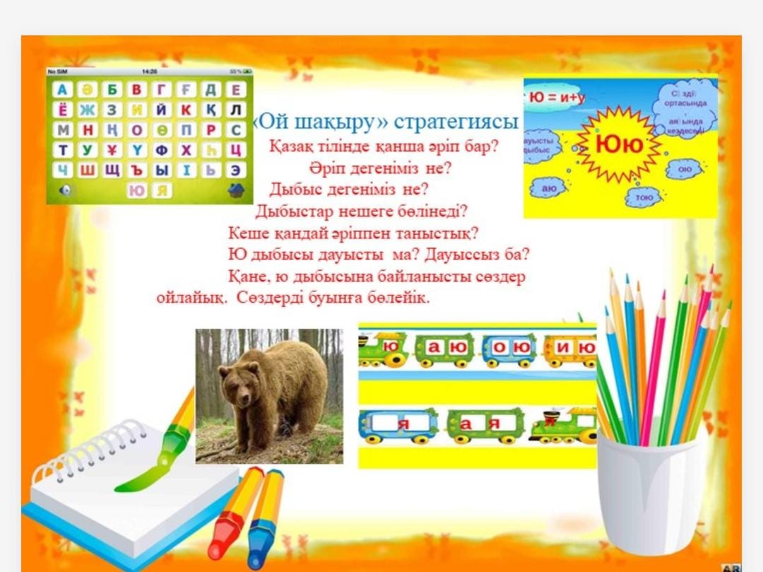 Оқушылар бір-біріне жылы тілектер айтады Алдыңғы білімді еске түсіру тапсырмала рын орындайды Сұрақтарға жауап береді Бейнебаян көреді Талқылауға қатысады Жұмбақтың шешімін табады Сұрақтарға жауап береді Хх әрпін хормен айтады Дауыссыз дыбысты біледі Дыбыстарды ажырата алады Сергіту сәті Қара жорға биі Топтық жұмысты орындайды Сұрақтарға жауап береді Дәптерлеріне жазып алады Көркем жазады Өлеңді мәнерлеп түсініп оқиды Қорытынды ой жазады Сұрақтарға Жауап береді Үй тапсырмасы Кері байланыс жасайды |