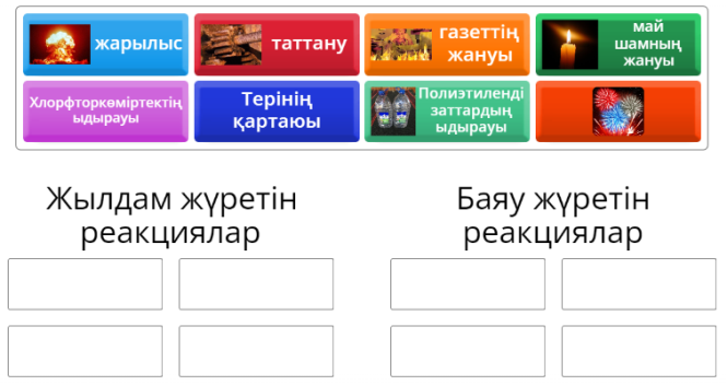Оқушылар химиялық реакция жылдамдығы туралы өз ойларын айтады. Жылдам және баяу жүретін реакцияларды ажыратады.
