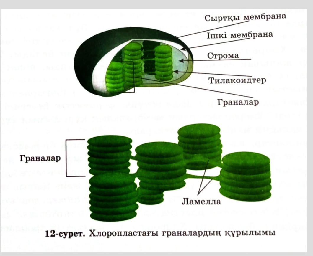 Хлоропластардың құрылысы. Хлоропласт сыртқы және ішкі - екі мембранадан тұрады, олардың арасында мембранааралық кеңістік болады. Хлоропластың ішінде ішкі мембранадан қатпарлана өсіп шығатын күрделі тилакоидті құрылым түзіледі. Хлоропласты толтырып тұрған гель тәрізді зат строма деп аталады (12-сурет).