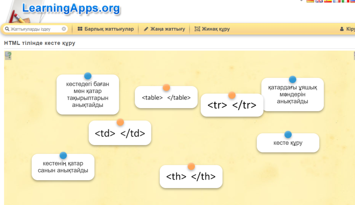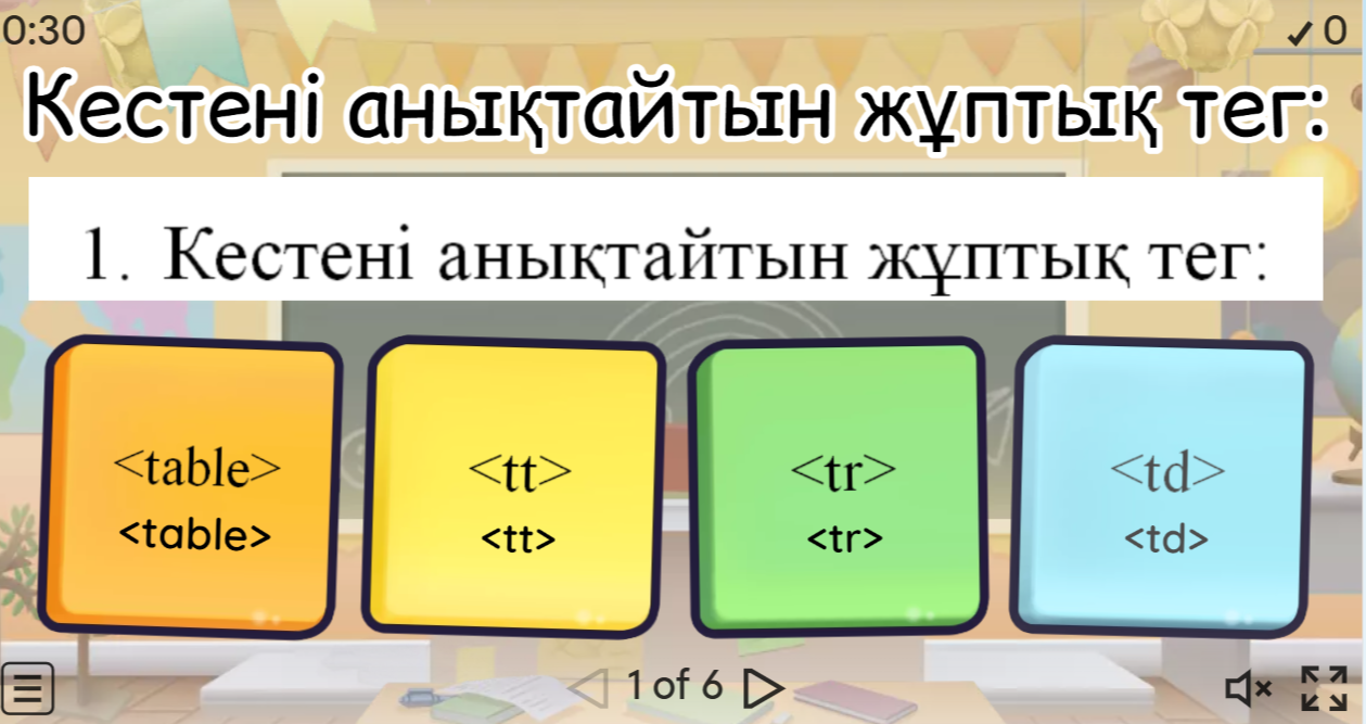 «Сұрақ меннен, жауап сеннен » әдісі арқылы Wordwall бағдарламасында 1. Кестені анықтайтын жұптық тег? 2.Кестенің жолын анықтайтын жұптық тег? 3.Кестенің ұяшығын анықтайтын тег? 4.Кестенің шетін қою үшін қандай атрибут қолданылады? 5.Бір жолдағы іргелес екі ұяшықты біріктіру? 6.Бір бағандағы іргелес екі ұяшықты біріктіру? сұрақтарға жауап береді.