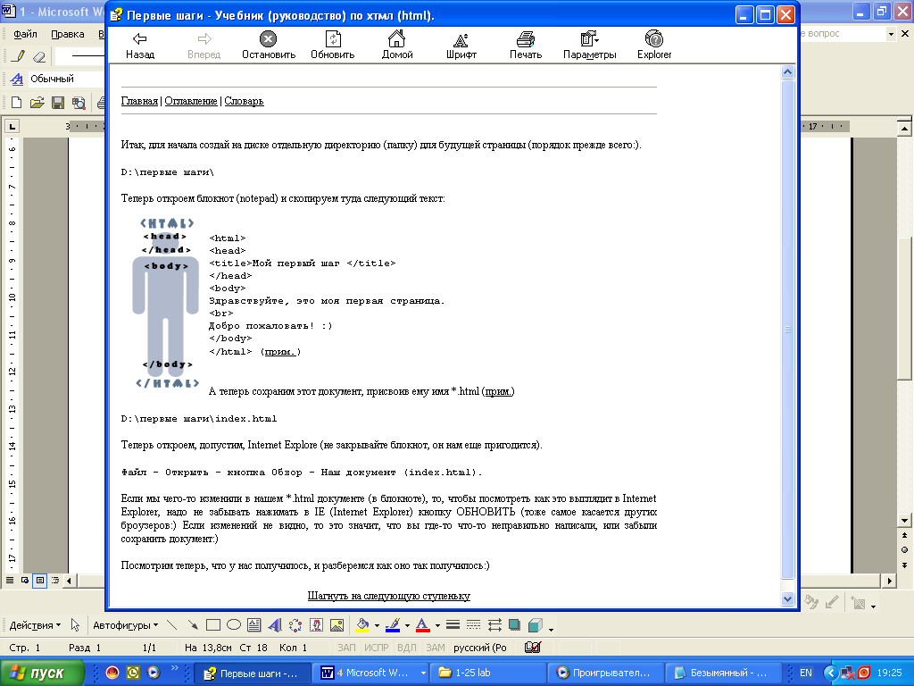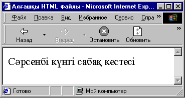 Осылай түзетілген мәтінді Файл - Сохранить командасы арқылы қайта дискіге жазып қояйып, Блокнот терезесін төменге жасырып, қайтадан Тапсырмалар тақтасында белгішесі көрініп тұрған Алғашқы HTML файлы атын шертіп, Microsoft Internet Explorer броузері терезесін ашып қоямыз.