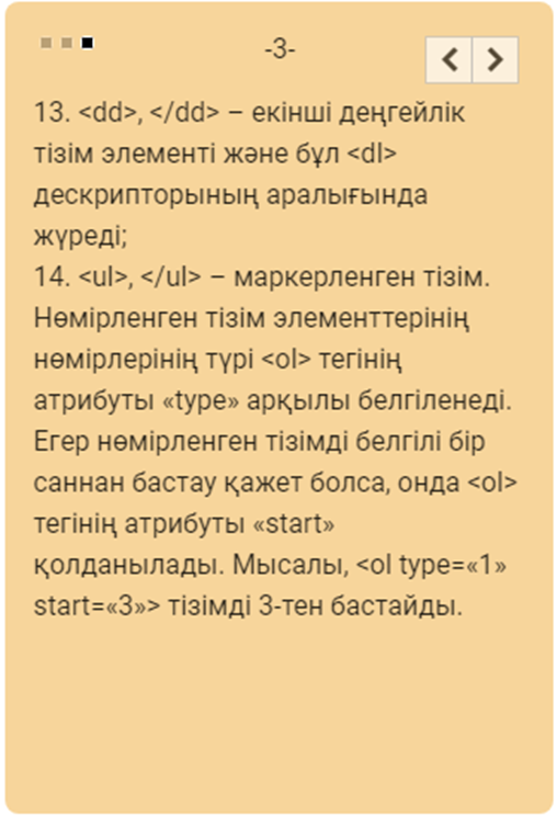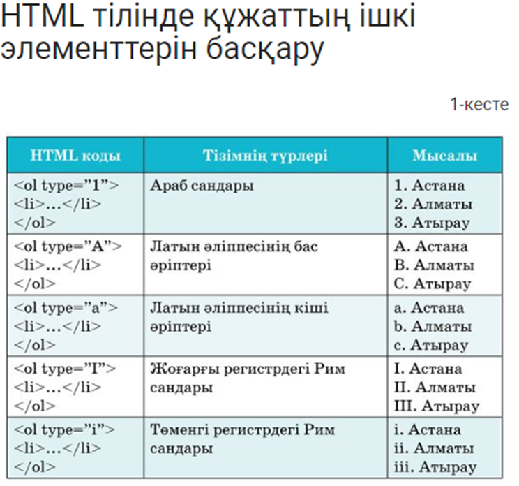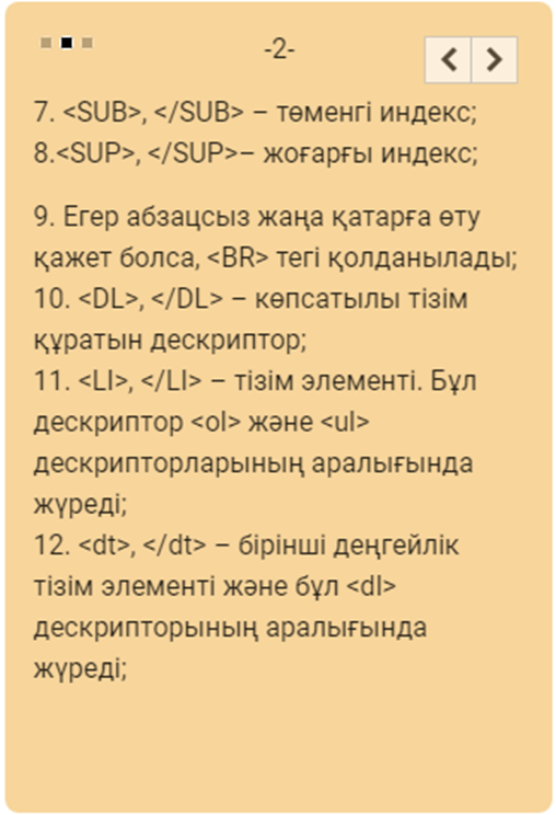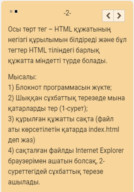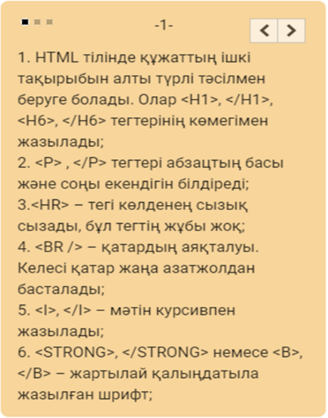 - HTML тілі туралы біледі - HTML тегтері туралы біледі |