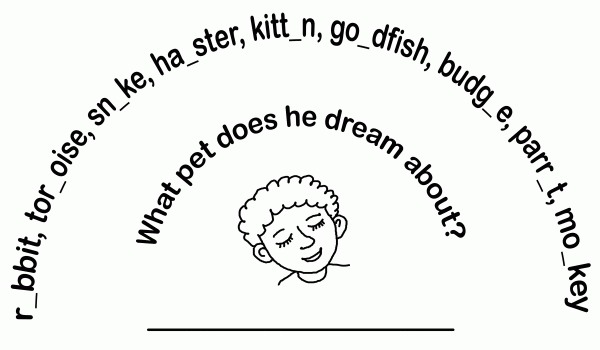 Задание для 2-3 года обучения английскому языку. Вписав в клетки недостающие буквы, вы узнаете, какой питомец снится мальчику.