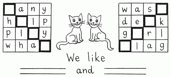 Задание для уроков английского языка в начальной школе. Вписав в клетки недостающие буквы, вы узнаете, что любят котята.