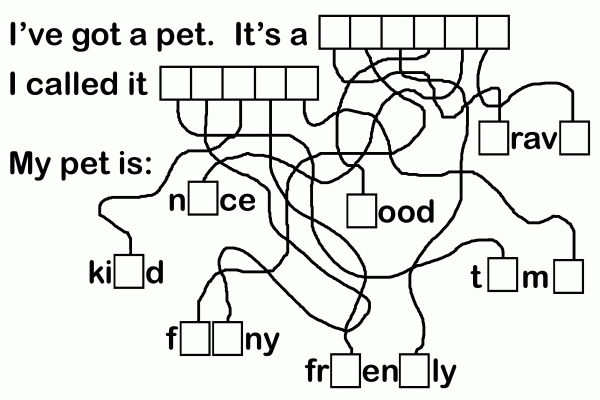 Задание для 2-3 года обучения английскому языку. Чтобы узнать, какое животное является домашним питомцем и как его зовут, нужно догадаться, какие прилагательные его характеризуют, и вписать в клетки недостающие буквы.