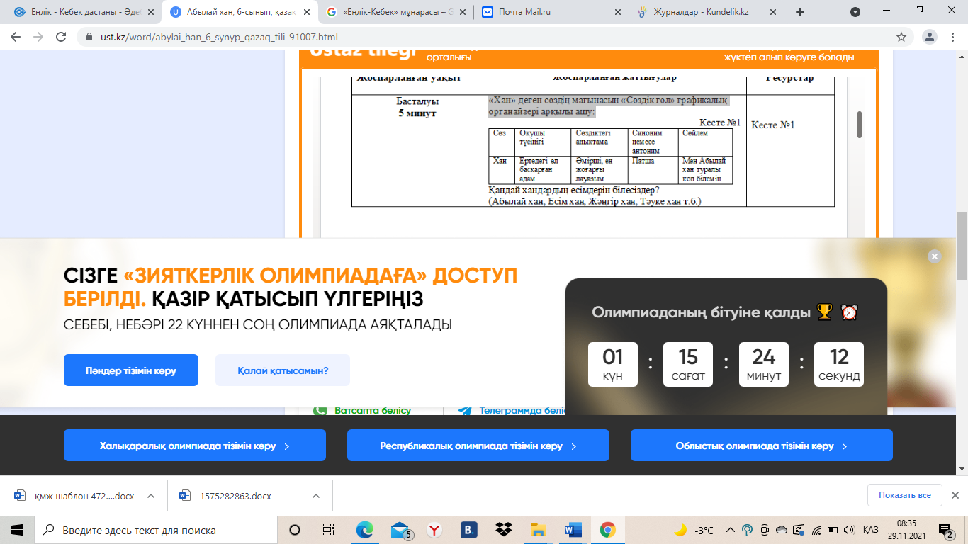 Оқушылармен сәлемдесіп, зейінін сабаққа аударады, көтерілетін мәселені болжайды. Оқушылар «Хан» сөзінің мағынасын графикалық органайзерді толтыру арқылы түсіндіреді. Оқушылар суреттегі тұлға туралы білетін мәліметтерін ортаға салады. Сабақтың тақырыбы мен мақсаты анықталады. |