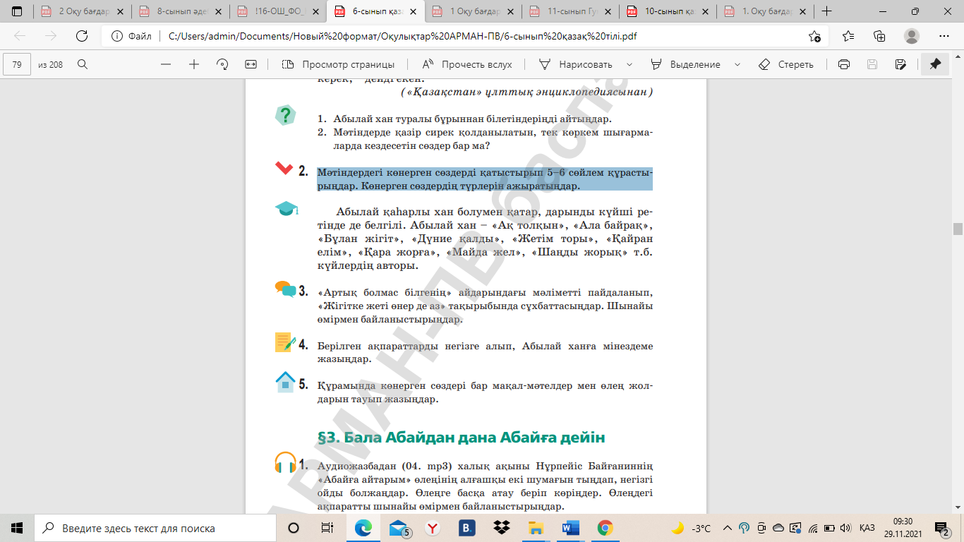 ҚБ ОҚЫЛЫМНАН КЕЙІН. 2-тапсырма. Мәтіндердегі көнерген сөздерді қатыстырып 5–6 сөйлем құрастырыңдар. Көнерген сөздердің түрлерін ажыратыңдар.