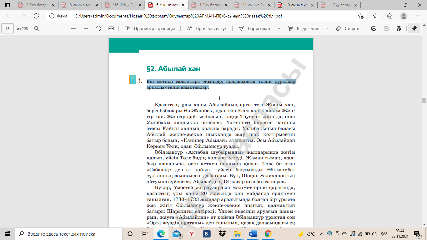 ІІ. ОҚЫЛЫМ ТАПСЫРМАСЫ. Мағынаны тану.Екі мәтінді салыстыра оқыңдар, қолданылған тілдік құралдар арқылы стилін анықтаңдар. 1-мәтін