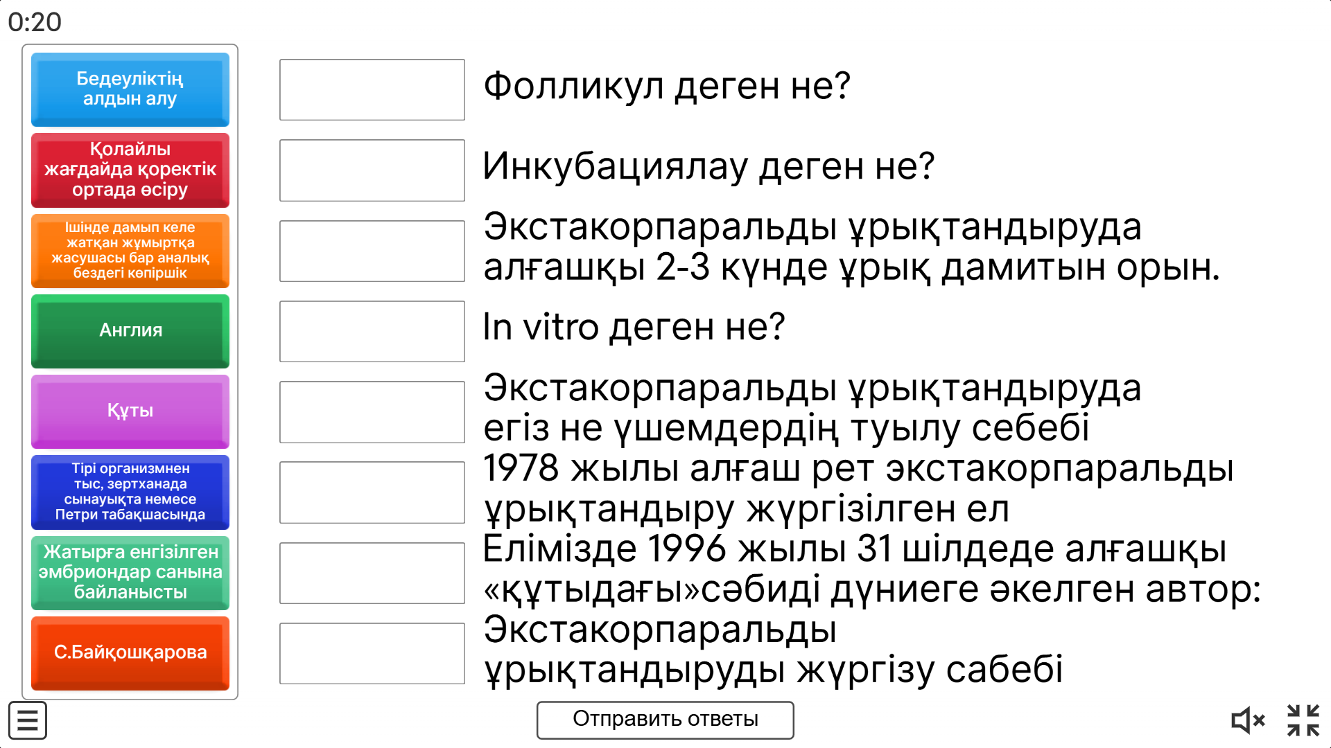 Оқушылар бейнедегі ақпаратпен танысып, сабақтың тақырыбын болжайды. Бос орындарға сөздерді қойып, мәтінді толықтырады. Сұрақтарға жауап бер. Тұжырымдарды жауаптарымен сәйекестендіреді Сәйекестендіру тестін орындайды |