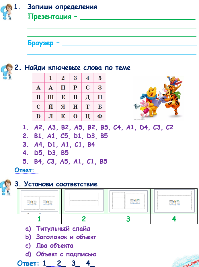 4.2.3.1 выбирать макет для слайда; 4.3.1.1 осуществлять поиск информации (файлов и папок на компьютере; 4.3.2.1 использовать настройки браузера (создавать закладки, просматривать историю и загрузки) |