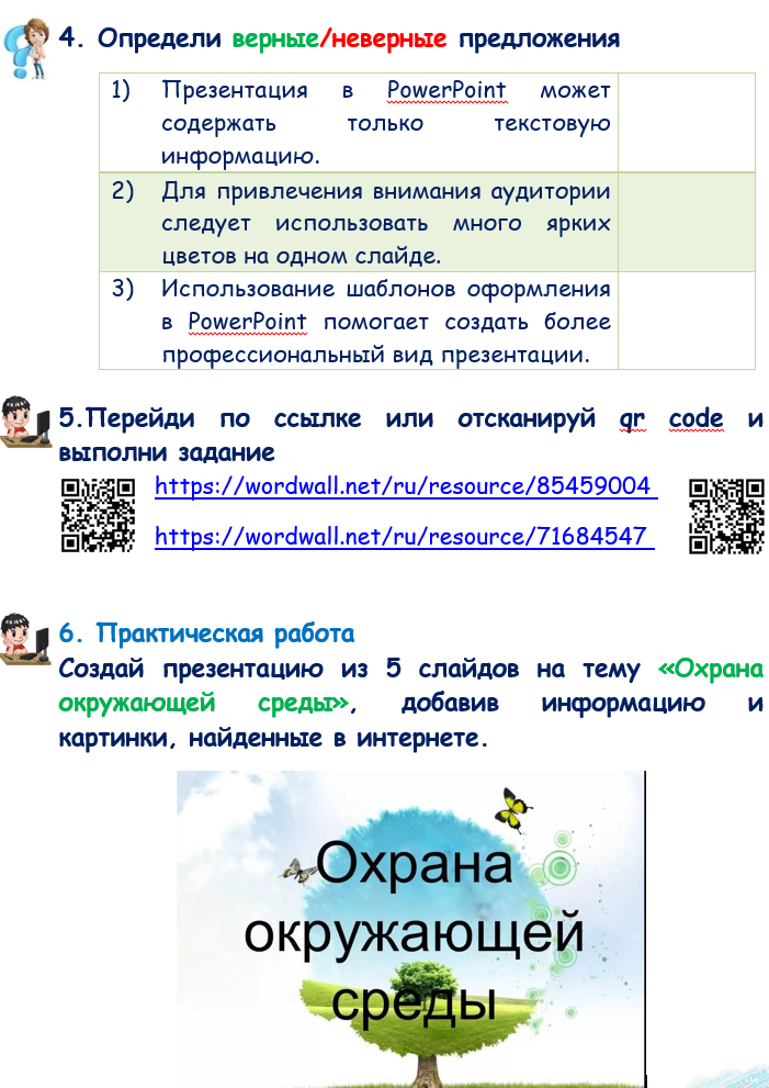 Смотрят ролик Работают в парах Выполняют физминутку Дескриптор: -записывает определения Дескриптор: -находит ключевые слова Дескриптор: -устанавливает соответствие Дескриптор: -определяет истинность высказываний Дескриптор: -выполняет интерактивные задание Дескриптор: - создаёт презентацию, содержащую текст и изображение, - применяет дизайн, переходы к презентации |