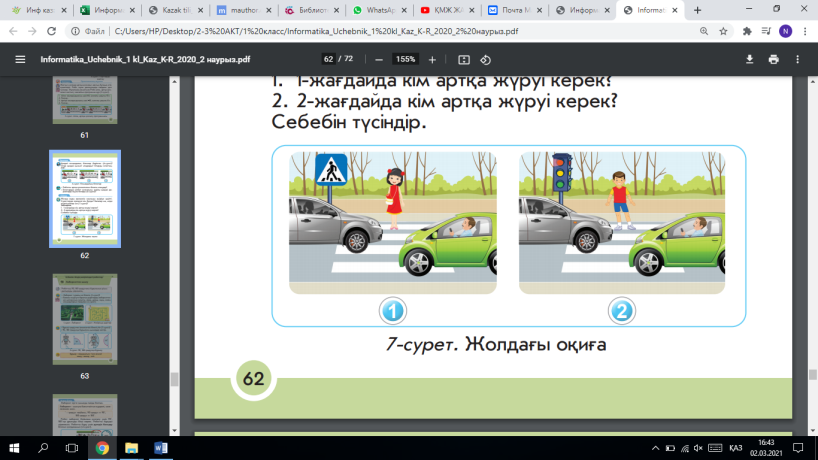 (Ө) Дәптермен жұмыс істеу. «Суреттер сөйлейді» әдісі. ***. 3- тапсырма Жолда жүру ережесін сақтамау өміріңе қауіпті. Суреттерде ережені кім бұзды? Балалар ма, әлде жүргізушілер ме (7-сурет)? Тапсырма: 1. 1-жағдайда кім артқа жүруі керек? 2. 2-жағдайда кім артқа жүруі керек? Себебінтүсіндір. |