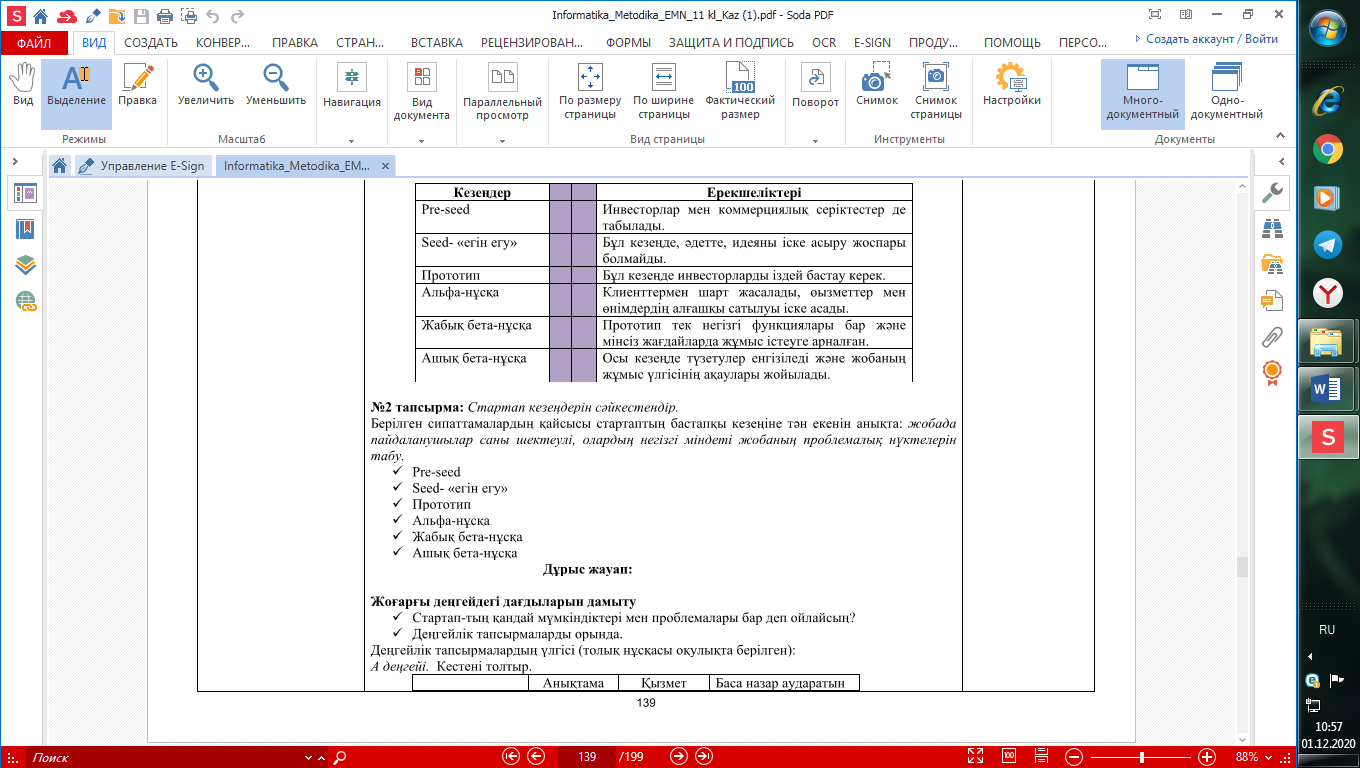 №2 тапсырма: Стартап кезеңдерін сәйкестендір. Берілген сипаттамалардың қайсысы стартаптың бастапқы кезеңіне тән екенін анықта: жобада пайдаланушылар саны шектеулі, олардың негізгі міндеті жобаның проблемалық нүктелерін табу. Pre-seed Seed- «егін егу» Прототип Альфа-нұсқа Жабық бета-нұсқа Ашық бета-нұсқа Дұрыс жауап: _____________________ Жоғарғы деңгейдегі дағдыларын дамыту Стартап-тың қандай мүмкіндіктері мен проблемалары бар деп ойлайсың? Деңгейлік тапсырмаларды орында. Деңгейлік тапсырмалардың үлгісі (толық нұсқасы оқулықта берілген): А деңгейі. Кестені толтыр