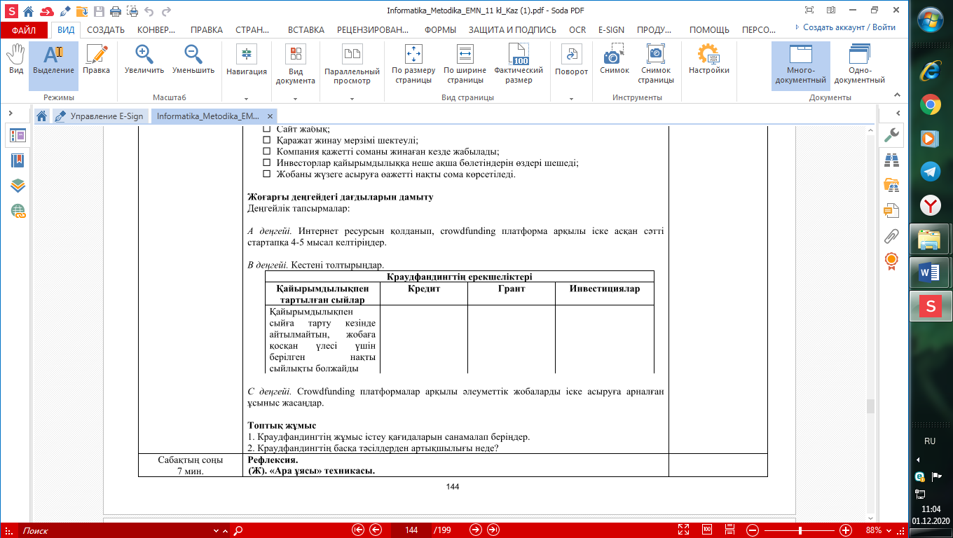 Педагог сабақ мақсаттарын хабарлайды: краудфандинг платформасын; краудфандинг платформасымен жұмыс істеу қағидаларын білетін боласыңдар. Оқулықпен жұмыс. Ақпаратты «Инсерт» әдісі бойынша оқу. Топтағы оқушылар мәтінді оқып, арнайы белгі қойып отырады: + - мұны білемін; – - мен басқаша ойлағанмын, бұл менің ойлағаныма қарама-қарсы болып шықты; v – мен үшін бұл жаңа нәрсе; ? – маған бұл түсініксіз, түсіндіру, нақтылау қажет. Топтың спикері оқылған нәрсенің мәнін түсіндіреді. Мұғалім оқушылармен сөйлеседі. Мәтіннің түсініксіз жерлерін түсіндіреді. – Краудфандинг – бұл кез келген ниет білдірушіден белгілі бір жобаны қаржыландыру үшін қаражат алудың бір түрі. Ақша жинайтындар реципиенттер немесе авторлар деп аталады (егер жоба краудфандинг алаңында орналасса), ал қайырымдылық беретіндер донор, демеуші немесе инвесторлар деп аталады. Шағын зерттеу Оқулық пен интернет ресурстарды қолданып, барлық сұрақтар бойынша зерттеу жүргізеді. Білу және түсіну 1. Crowdfunding платформа деген не? 2. Краудфандингтің кәдімгі қаражат жинаудан өзгешелігі неде? Қолдану Краудфандинг-платформаның жұмыс істеу принципін түсіндір. Жұптық жұмыс: №1 тапсырма: Жобасын жүзеге асыру үшін ақша жинайтын адамдар қалай аталады? Инвесторлар Авторлар Демеушілер Донорлар Реципиенттер Жасаушылар №2 тапсырма: Крауфандинг платформаларын пайдаланып қаражат жинаудың ерекшеліктерін таңда. Қаражат жинау мерзімі шектеусіз; Сайт жабық; Қаражат жинау мерзімі шектеулі; Компания қажетті соманы жинаған кезде жабылады; Инвесторлар қайырымдылыққа неше ақша бөлетіндерін өздері шешеді; Жобаны жүзеге асыруға өажетті нақты сома көрсетіледі. Жоғарғы деңгейдегі дағдыларын дамыту Деңгейлік тапсырмалар А деңгейі. Интернет ресурсын қолданып, crowdfunding платформа арқылы іске асқан сәтті cтартапқа 4-5 мысал келтіріңдер. В деңгейі. Кестені толтырыңдар.