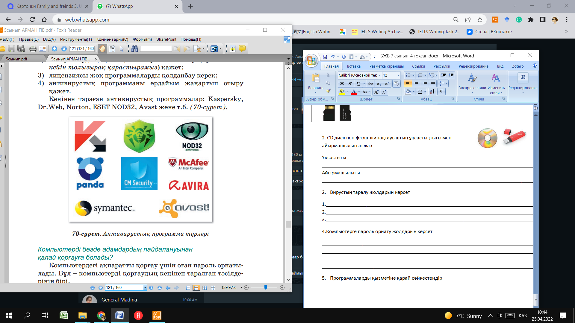 5.1.1.1 сандық ақпарат тасымалдағыштарды сипаттау 5.4.2.2 құжаттарға пароль орнату; 5.1.3.1 ортақ файлдарды орналастыру, өзгерту, жүктеу |
