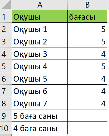 2. Төменде кестеде 5 баға және 4 баға алған оқушылар санын есептеңіз. Есептің формуласын жазыңыз.