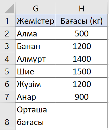 4. Excel бағдарламасында жемістер және олардың бағалары берілген. Кірістірілген функцияны қолданып, олардың орташа мәнін есептеу функциясын жазыңыз