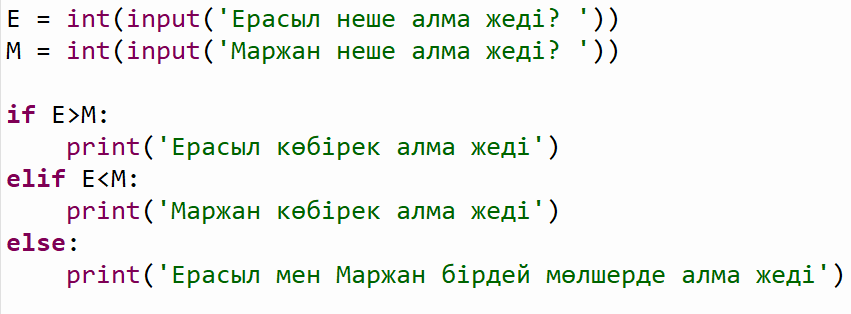 Екі бала бар - Ерасыл мен Маржан. Олардың әрқайсысы белгілі бір мөлшерде алма жеді. Кім көп алма жегенін немесе бірдей мөлшер -де жегенін салыстыратын программа жазыңыз.