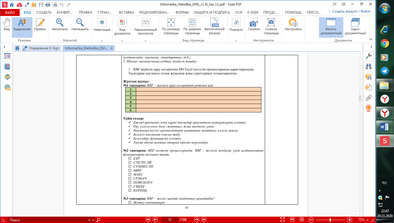 1. Теориялық материалмен жеке жұмыс: мәтінді бөліктерге бөлдіріп оқыту, түсіндіру. Оқушылардың пікірлерін тыңдау. Нейрондық желіні құру үшін көптеген әдістер бар. Ең көп тараған әдіс – Python, Java, С++ сияқты программалау тілін қолдану. Қарапайым RBF нейрондық желіні MS Excel-дегі кестелік процессорда құруға болады. Бұл желі жіктеу есептерін шешуде қолданылады. Класс – жіктеу жүйесіндегі белгілі топты кейбір белгілеріне қарай жіктеп топтастыру. Радиалды-базистік жүйенің функциясы тікелей таралу белгісінің нейрондық желісін ұсынады. Ол аралық (жасырын) радиалды-симметриялық нейрондардан тұрады. Радиалды-базистік функциясының жүйесінде жасырын нейрондар таңдалынған орталық пен осы орталықтың маңайындағы нөлдік емес мағынаны қабылдайтын функцияларды жүзеге асырады. RBF нейрондық желісінің жұмыс алгоритмін қарастырайық: 1) нейрон бірнеше кіріс каналдары арқылы сигнал/ақпарат қабылдайды; 2) әр кіріс белгісі торап арқылы өтеді/бірігу, нақты салмағы бар/қарқындылық, биологиялық нейронға синаптикалық белсенділігінің сәйкестігі; 3) әрбір нейронға белгілі бір межелі мағына беріледі; 4) шаманы алу үшін нейронды белсендіретін өлшенген кіріс саны есептелінеді; 5) белсенділік белгісі белсенділік функциясы арқылы өзгереді және шығыс белгісі алынады. 2. Нейрондық желінің кестелік үлгісін құру үшін орындалатын алгоритмдерді орындау реті түсіндіріледі. 1. Деректер қорын мысалдармен құрастыру: бұл берілген тапсырмаға сәйкес сипаттамалар және үлгінің негізгі белгілері. 2. Барлық деректер жиынтығын екі ішкі жиынтыққа бөлу: үйретуші және тестік (қажет жағдайда тағы бір ішкі жиынтық қосылуы мүмкін: растаушы). 3. Берілген есепке сәйкес жүйе белгілерін таңдау. 4. Желінің кірісіне ұсына алатындай деректерді өзгерту (бұл үшін үйреншікті әдістер қолданылады: нормалау, стандарттау, т.б.). 5.Шығыс мағынасының кодтау жүйесін таңдау. 1. RBF жүйесін құру алгоритмін MS Excel кестелік процессорында қарастырылады. Түсіндірме оқулықта толық жазылған және суреттермен толықтырылған. Жұптық жұмыс: №1 тапсырма: RBF – желісін құру алгоритмін ретімен қой.