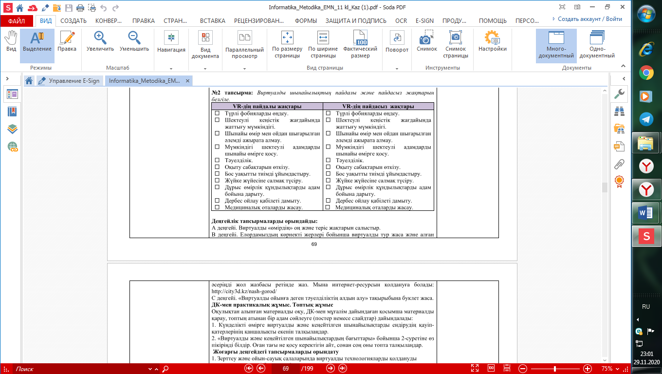 Педагог бүгінгі сабақтың мақсаттарымен таныстырады: виртуалды және кеңейтілген шынайылықтың адамның психикалық және физикалық денсаулығына ықпалын; виртуалды және кеңейтілген шынайылық технологияларының даму болашағын білетін боласыңдар. Оқулықпен жұмыс – Бұқаралық ақпарат құралдарынан, көркем әдебиетте және түрлі интернет ресурстарда иммерсивтілік деген ұғымды естіген шығарсың. Көптеген сарапшылар: «Иммерсивті есептеулердің жаңа дәуірі басталды» деген пікірде. Соңғы 30 жылда технологиялар керемет дамыды. Біз қаншама жыл компьютерді басқару үшін пернетақтамен тінтуір қолдандық. Смартфондар дәуірінде «сырт еткізіп басуға», «саусақпен жұмыс істеуге» және «сөйлесуге» болатын «ақылды» экрандардың пайда болды. Педагог мәтінді бөліктерге бөліп оқытып, әр бөлікке түсіндіру жұмысын жүргізеді: Білу және түсіну Ақпаратты «Инсерт» әдісі бойынша оқу. Топтағы оқушылар мәтінді оқып, арнайы белгі қойып отырады: + - мұны білемін; – - мен басқаша ойлағанмын, бұл менің ойлағаныма қарама-қарсы болып шықты; v – мен үшін бұл жаңа нәрсе; ? – маған бұл түсініксіз, түсіндіру, нақтылау қажет. Топтың спикері оқылған нәрсенің мәнін түсіндіреді. Мұғалім оқушылармен сөйлеседі. Мәтіннің түсініксіз жерлерін түсіндіреді. Жұптық жұмыс: №1 тапсырма: Ұсынылған нұсқалардың қайсысы виртуалды және кеңейтілген шынайылықтың негізгі бағытына жатпайды? Мобильді ойындар, нұсқаулыұтар; «Сатып алмас бұрын зерделе», қызметтер жайлы ақпарат. Навигация, қосылған орам. Шынайылық – нақтылық құрылымдарын түсіну, мәліметтерді өңдеу. Геолокациолық білім, аударма. №2 тапсырма: Виртуалды шынайылықтың пайдалы және пайдасыз жақтарын Белгіле