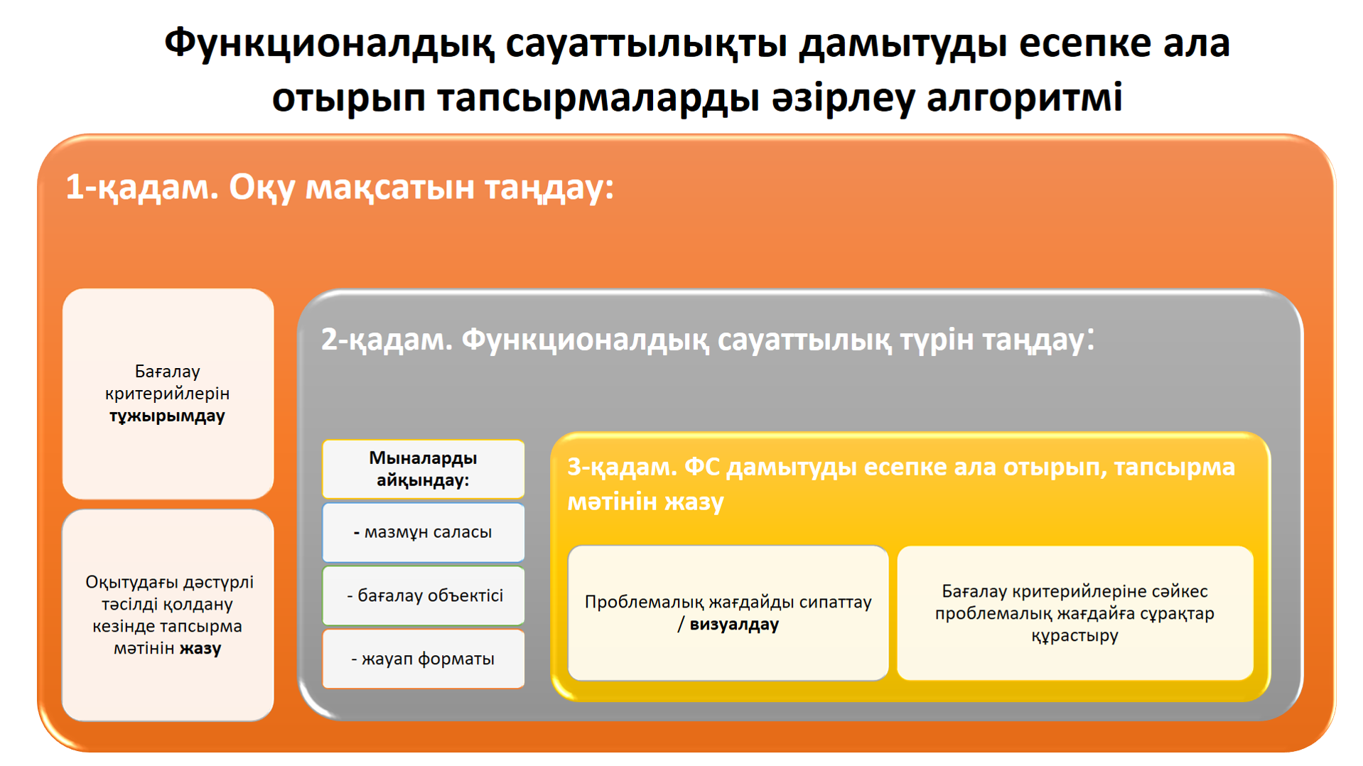 Практикада әр сабақта, сабақ мақсаты мен мазмұнына сай бір тапсырма міндетті түрде функционалдық сауаттылықты дамытуға арналған тапсырма қарастырылуы керек. Сабақта қарастырылатын функционалдық сауаттылықты дамытатын тапсырмалар құру үлгісі: