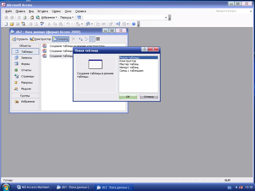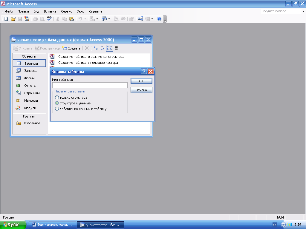 Кестелер режимінде жаңа кесте құруға мүмкіндік береді