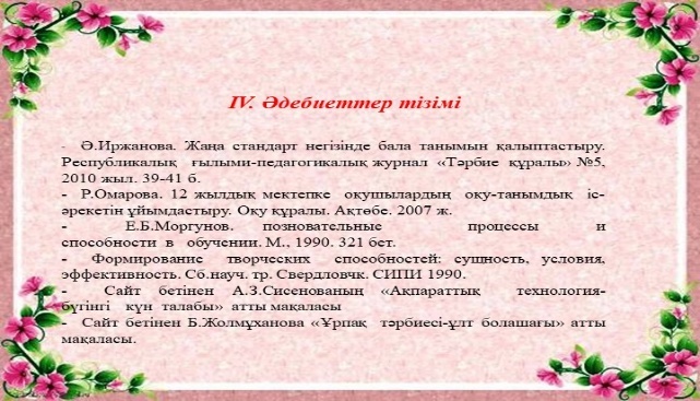 - Ә.Иржанова. Жаңа стандарт негізінде бала танымын