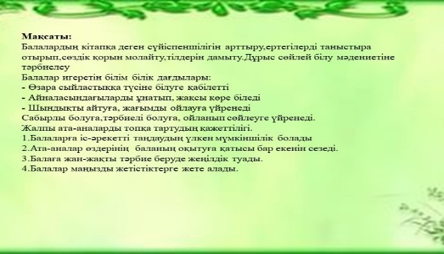 таныстыра отырып,сөздік қорын молайту,тілдерін дамыту.Дұрыс сөйлей