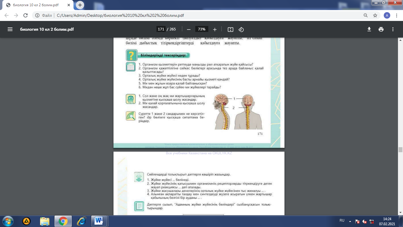 1. Организімнің біртұтастығы ненің арқасында жүзеге асады? 2. Адам организмі сыртқы ортаның үздіксіз өзгерістеріне не арқылы бейімделеді? 3. Орталық жүйке жүйесі қандай бөлімдерден тұрады? Осы тапсырманы орындау арқылы оқушылардың айтылым дағдысы қалыптасады. |