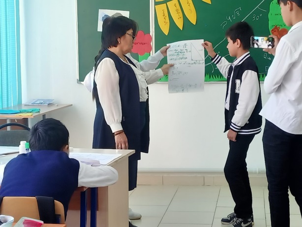 «Құстың отырған биіктігін табу» жоғары деңгейлік тапсырма болғандықтан «А» деңгейлі оқушыны тақта алдына шақырып , түсіндіре отырып барлық оқушылар түсінетіндей, сындарлы сұрақтарды қойып сыныппен бірге шығардық. Себебі, бұл есеп көлемді және бірнеше тақырыпты қамтитын еді. Сондықтан сынып оқушыларына «А» оқушы жақсы түсіндіріп, бірлесе сәтті шығарды.