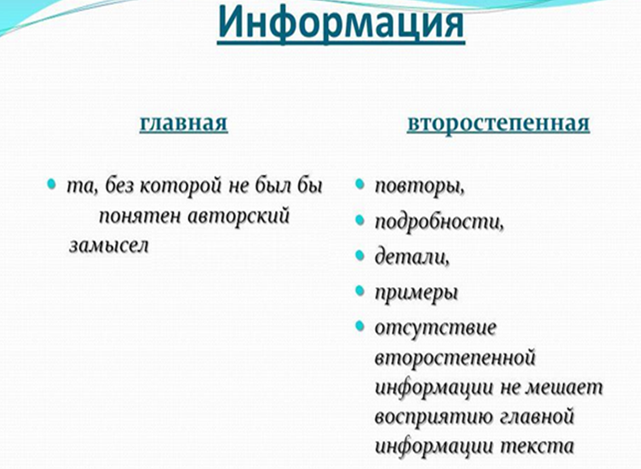 Сколько главной информации и сколько второстепенной информации смогли найти в данном тексте? Прочитайте выделенные главные и второстепенные информации. Скажите, как вы используете информацию из текста в жизни? Теперь посмотрите на таблицу, где указаны главная и второстепенная информации. Оцените свою работу сами. Самооценивание .