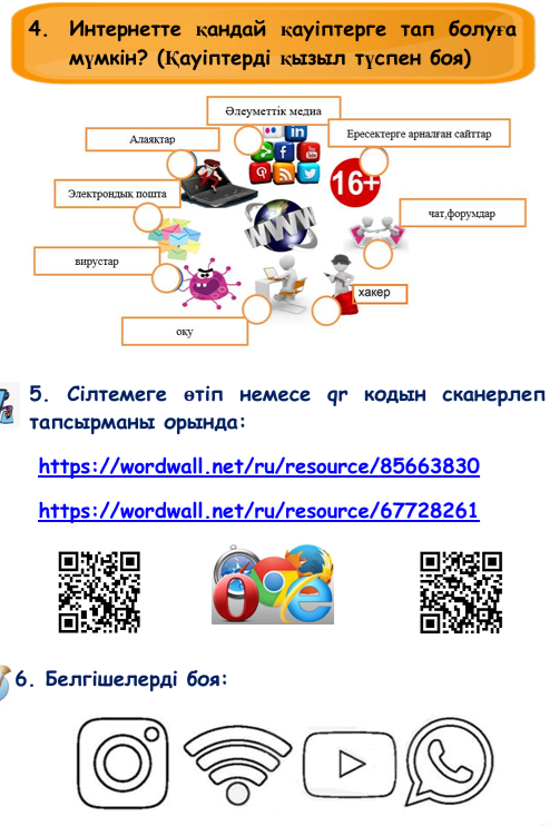 - Интернетті пайдаланып не істеуге болатынын айтыңыз. Интернеттегі байланыс кезінде қандай қауіпсіздік шараларына назар аудару керек? Оқушылар сұрақтарға жауап беріп, топтық талқылау өткізгеннен кейін мұғалім сабақ тақырыбын атайды, бағалау мақсаттары мен критерийлерімен таныстырады. Білімді бекіту
