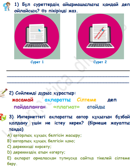 Жаңа материалды меңгеру: 1-суретті мұқият қарастырыңыз. Бұл сурет не туралы айта алады? Үй тапсырмасын өз бетіңізше орындай алмаған кезде не істейсіз? Сабақта немесе жобаларда берілген тапсырмаларды орындау үшін Интернет желісіндегі ақпаратты қалай пайдаланасыз? Авторлық құқық дегеніміз не? Интернет желісінен алынған ақпаратқа не үшін сілтеме жасау керек? Оқулықпен жұмыс. Мұғалім жаңа ақпаратпен таныстырады, бірге талқылайды (бейнеролик, презентация арқылы). Сергіту сәті