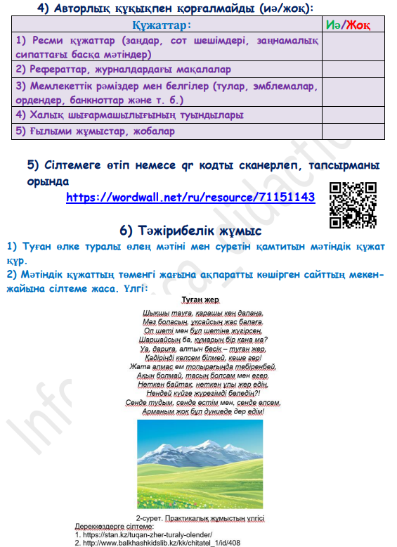Дескрипторлар: - өз пікірін жазады - плагиат деген не екенін жазады - авторлық құқықты бұзбайтын жағдайларды анықтайды - авторлық құқықпен қорғалмаған құжаттарды анықтайды - мәтіндік құжат жасайды, дереккөзге сілтемелерді көрсетеді |