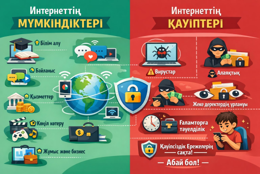 Интернет — шексіз білім алу, қарым-қатынас, жұмыс және ойын-сауық мүмкіндіктерін (онлайн оқыту, электронды коммерция, ақпарат іздеу) ұсынатын заманауи құрал. Сонымен қатар, ол кибертәуелділік, жеке мәліметтердің ұрлануы, вирустар және зиянды контент сияқты елеулі қауіптер төндіреді. Қауіпсіздік ережелерін сақтау — интернетті тиімді пайдаланудың негізі. |