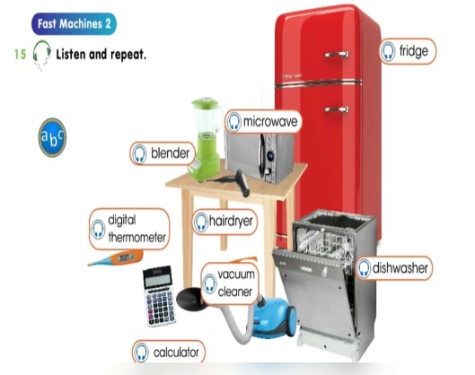 • learners listen and repeat. Then number the pictures. ANSWERS 2 C 3 B 4 H 5 G 6 E 7 D 8 A • learners answer the questions. ANSWERS 1 calculator 2 hairdryer 3 vacuum cleaner 4 microwave, dishwasher, fridge, blender 5 microwave 6 fridge • learners thinking: Which of these machines are important to you? to your mum? to your dad? ANSWERS The calculator is important to me. I use it to do my maths homework. The hairdryer is important to my mum. She uses it to dry her hair. The dishwasher is important to my dad. He uses it to wash the dishes • learners read and write. ANSWERS 2 S 3 M 4 A 5 O 6 A 7 M 8 C 9 S • learners complete the sentences with words from Ex. 20. ANSWERS 1 fantastic new 2 small metal 3 small plastic 4 old green |