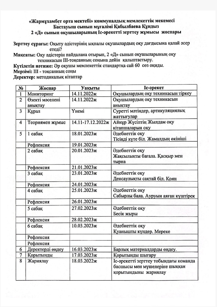 «Іс-әрекетті зерттеу» жұмысының жоспары