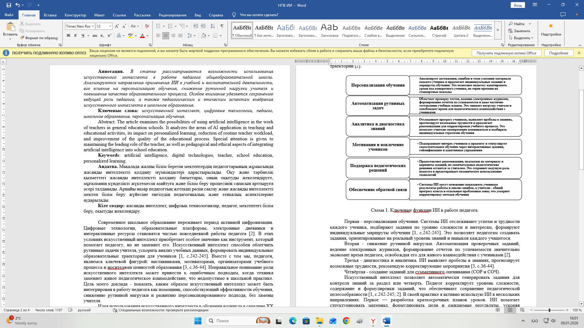 Современное школьное образование переживает период активной цифровизации. Цифровые технологии, образовательные платформы, электронные дневники и интерактивные ресурсы становятся частью повседневной работы педагога. В этих условиях искусственный интеллект приобретает особое значение как инструмент, который помогает педагогу, но не заменяет его. Искусственный интеллект способен облегчить рутинные задачи учителя, ускорить анализ учебных данных, формировать индивидуальные образовательные траектории для учеников [1, с.45-47]. Вместе с тем мы, педагоги, являемся ключевой фигурой: наставниками, мотиваторами, организаторами учебного процесса и носителями ценностей образования. Неправильное понимание роли искусственного интеллекта может привести к ошибочным подходам, когда техника заменяет живое педагогическое взаимодействие, что недопустимо в школьной практике [2, с.78-80]. Цель моего доклада - показать, каким образом искусственный интеллект может быть интегрирован в работу педагога как помощник, способствующий эффективности обучения, снижению рутинной нагрузки и развитию персонализированного подхода, без замены учителя [3, с.22-25].