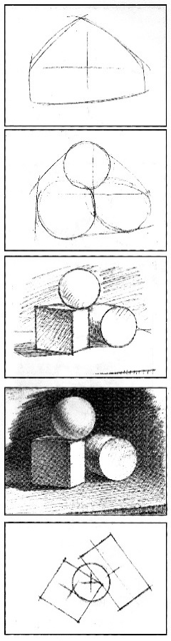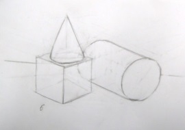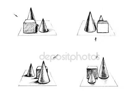 Задание 1: - Используя знания композиции, составьте натюрморт из нескольких геометрических фигур, в своих альбомах. При составлении композиции необходимо правильно поместить натюрморт из геометрических тел, на плоскости листа учитывая: 1. Композиционное построение группы геометрических тел, учитывая вертикальный или горизонтальный формат.